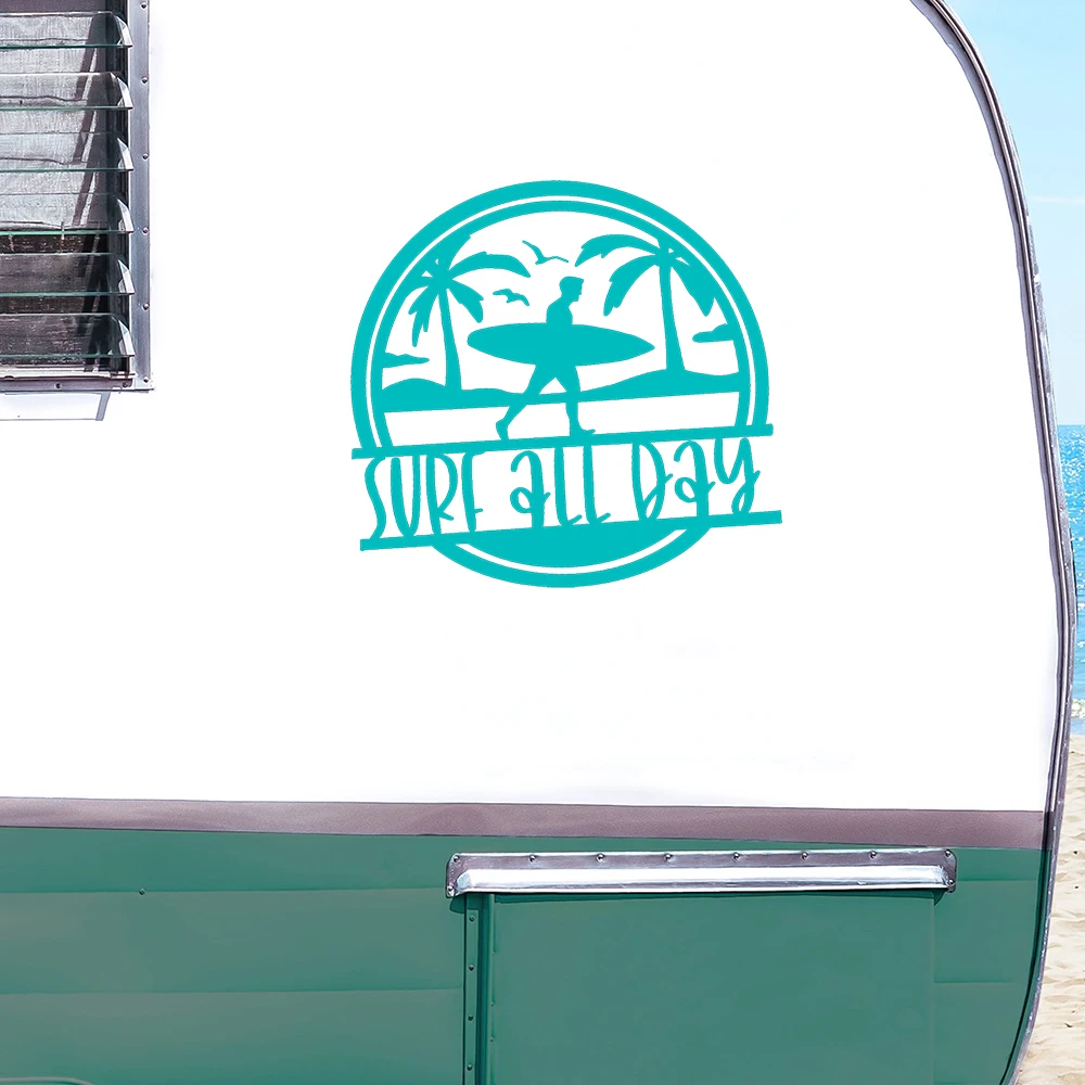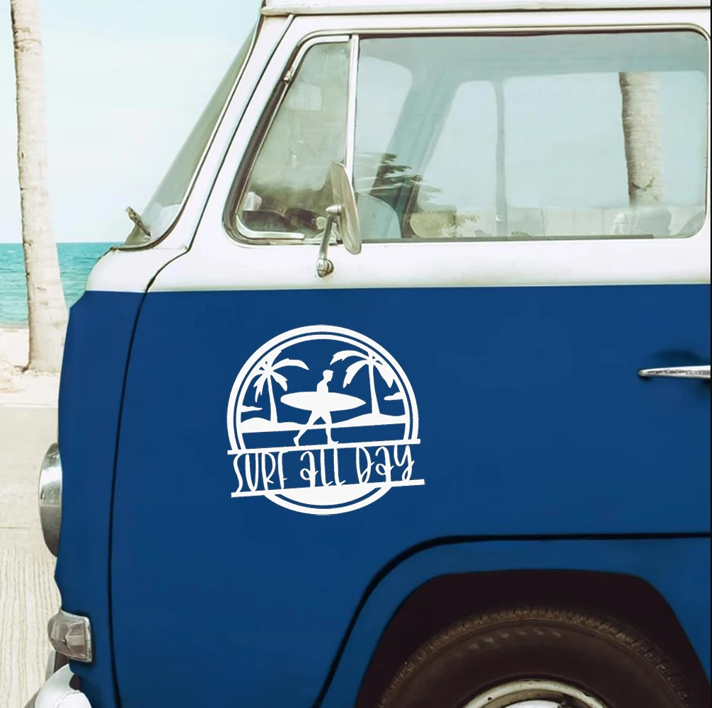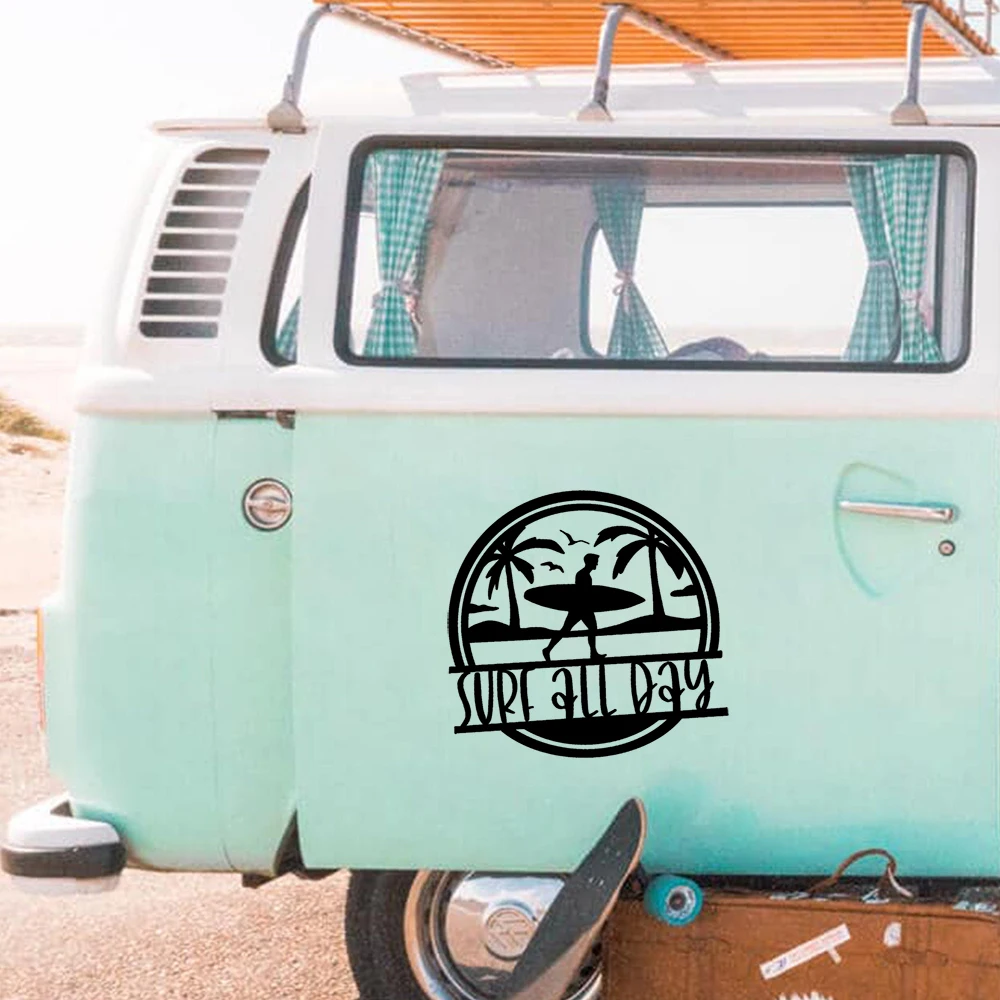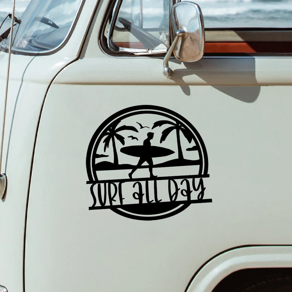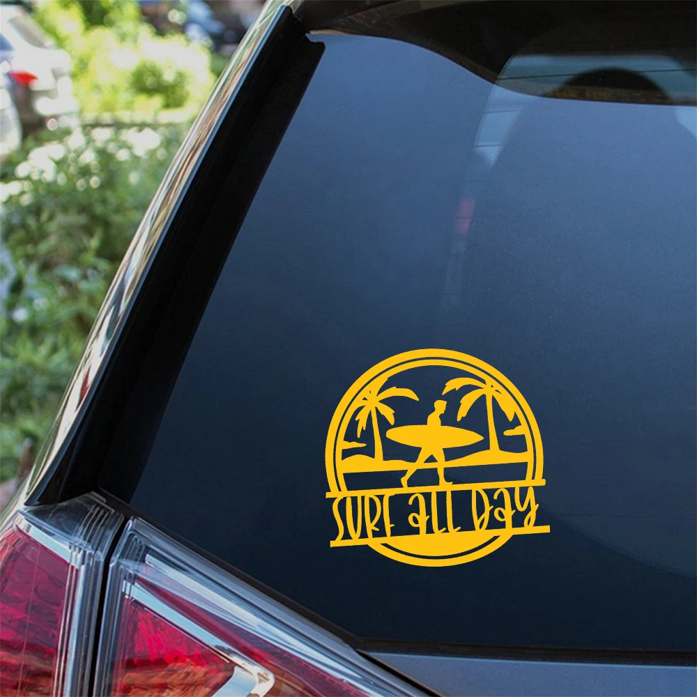 Car Stickers Palm Tree and Waves That Turn into The Sun Window Decal Bumper Sticker car accessories Surf All Day